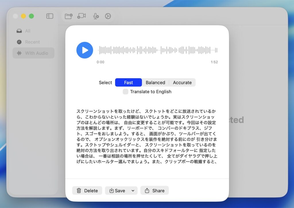 ・[PRO]音声保存、保存音声の再文字起こし、保存音声のエクスポート。