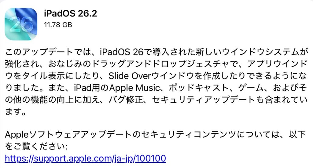 このアップデートでは、iPadOS 26で導入された新しいウインドウシステムが強化され、おなじみのドラッグアンドドロップジェスチャで、アプリウインドウをタイル表示にしたり、Slide Overウインドウを作成したりできるようになりました。また、iPad用のApple Music、ポッドキャスト、ゲーム、およびその他の機能の向上に加え、バグ修正、セキュリティアップデートも含まれています。