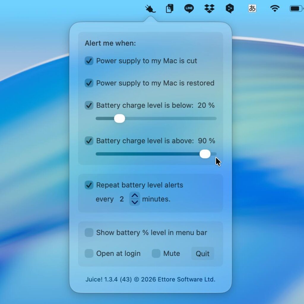 メニューバーにバッテリーの充電レベルを常に表示することも可能です。