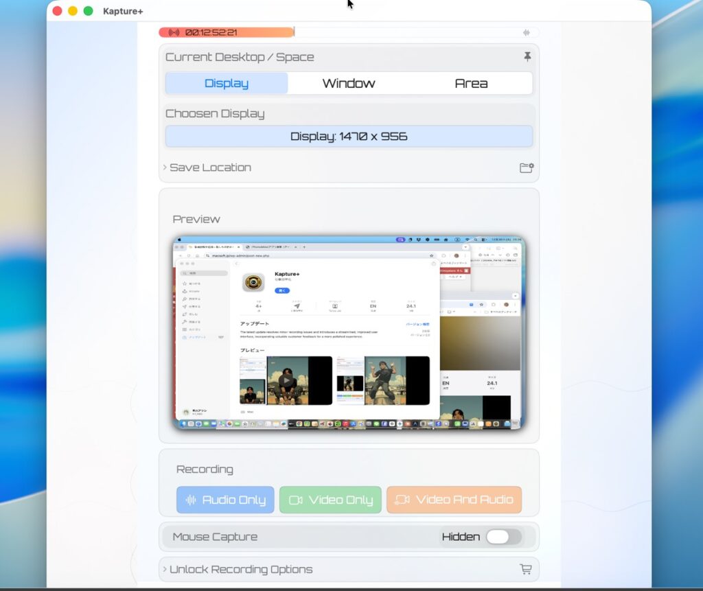 画面に表示されているウインドウや選択範囲、あるいは画面全体を録画するためのアプリ。