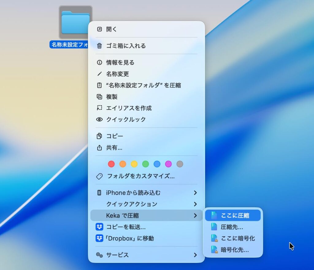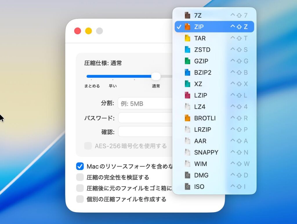 圧縮後にオリジナルファイルをゴミ箱に転送したり、Windowsで解凍しても不要ファイルが表示されないように「Macのリソースフォークを含めない」圧縮も可能です。