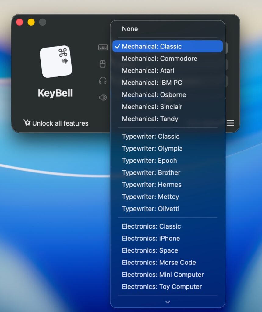 タイピングには7種類のメカニカルキーボード、7種類のタイプライター、6種類の電子デバイス、8種類の楽しいサウンド(泡やドラム、通知音など)から選べます。