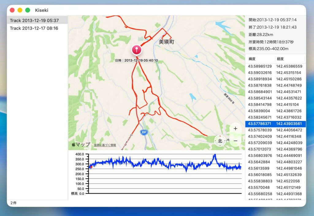 GPX形式のログファイルを読み込むと、ウインドウ内にその移動経路がマップ上に赤線で表示されます。標高の推移や地点ごとの緯度経度のチェックも可能です。