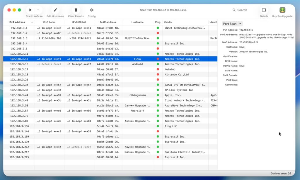 LanScan 8.0.21 - LAN上の全デバイスのIPアドレスやメーカー等を一覧表示