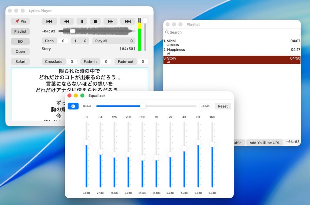 歌詞のフォントサイズ変更やmp3タイトルの編集、プレイリストの保存、読み込み、シャッフルに対応。