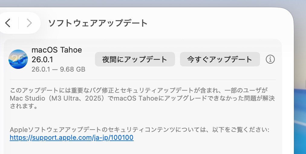 Mac Studio (M3 Ultra、2025) でmacOs Tahoeにアップグレードできなかった問題が解決されます。