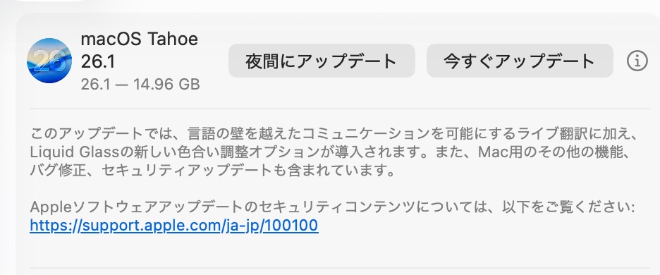 このアップデートでは、言語の壁を越えたコミュニケーションを可能にするライブ翻訳に加え、Liquid Glassの新しい色合い調整オプションが導入されます。また、Mac用のその他の機能、バグ修正、セキュリティアップデートも含まれています。