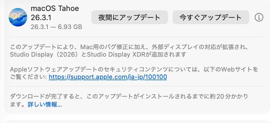 バグ修正に加え、外部ディスプレイの対応が拡張され、Studio Display (2026) とStudio Display XDRが追加されます