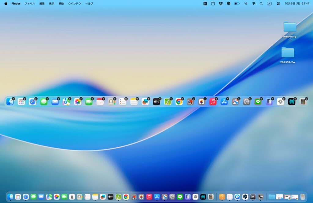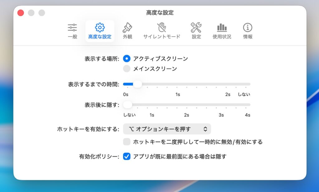 macOS標準のアプリ切り替えショートカット「command」キー+「tab」キーでは、起動しているソフトが多いと選択に時間が掛かってしまいますが、このアプリなら、「Option」キーを長押しするとDockに並んでいるアイコンがバーに並び、各アプリに割り当てられた数字キーを押すことで切り替えたり、アプリを起動したりできます。