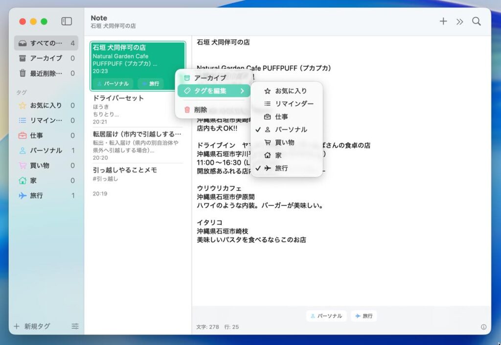 記録したメモは「タグ」を付けて分類でき、さらにアイコンや色を設定することで視覚的に整理できるのが特徴。文章の文字数や行数を自動でカウントする機能や、不要になったメモを保管できるアーカイブ機能も備えます。