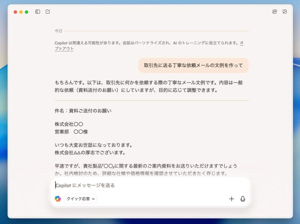 文章や音声で操作でき、ビジネスメールの作成、翻訳、校正、質問への応答など多彩な用途に活用できます。たとえば「資料送付の依頼文を作成して」と指示するだけで、丁寧なトーンのメール文が自動で整います。また、初対面の相手に送るメール文の作成も、Copilotに任せればスムーズ。形式に迷うことなく、自然で礼儀正しい文章が得られます。