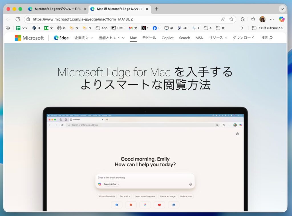 Microsoft製WebブラウザのMac版。Windowsで使っている「Microsoft Edge とパスワード、お気に入り、設定が自動で同期されます。