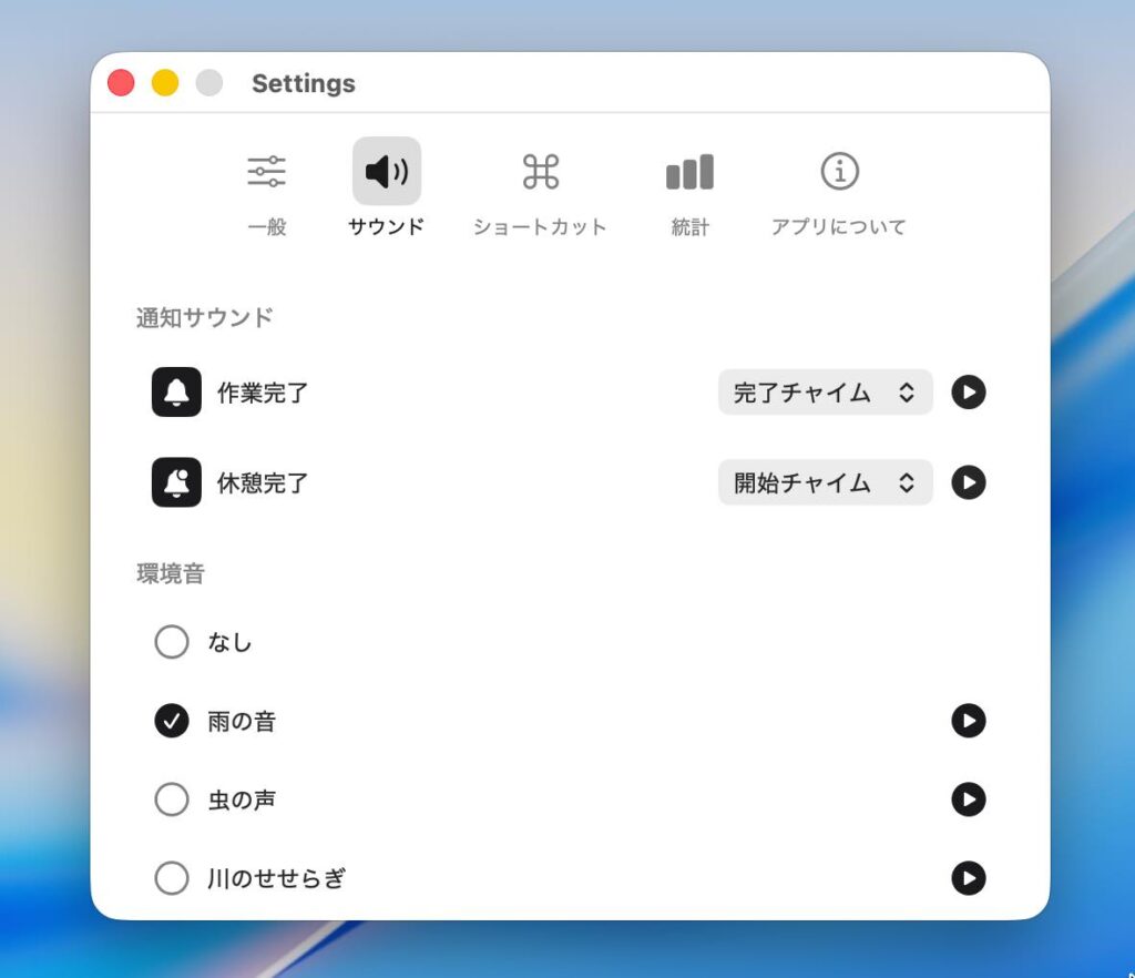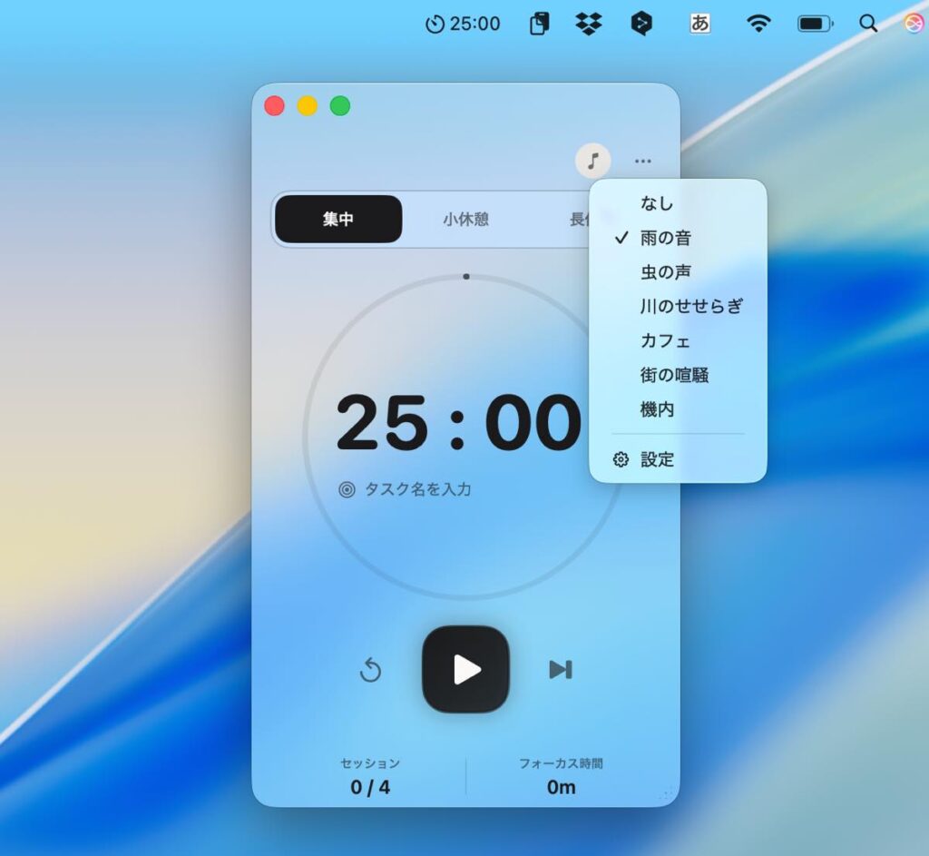 作業中は、残り時間をメニューバーと半透明のウインドウに表示。視界を大きく妨げないため、目の前の作業に集中しやすいのが特徴です。半透明ウインドウは常時最前面に固定でき、時間をさりげなく意識しながら進められます。