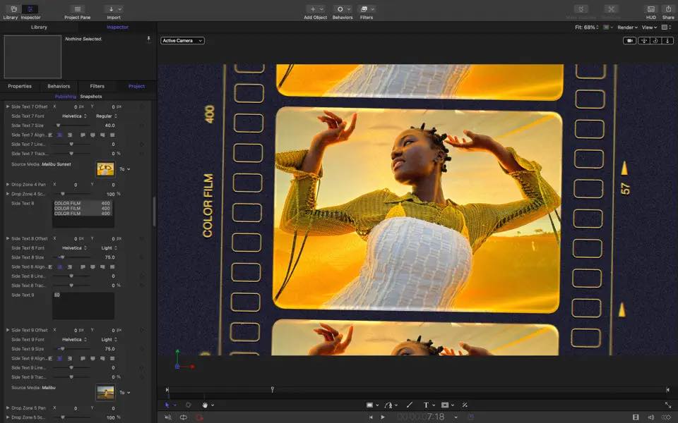Final Cut Proの2D、3Dのタイトル、トランジション、エフェクトを簡単に作成し、変更の結果をリアルタイムで確認しながらアニメーションを制作できます。