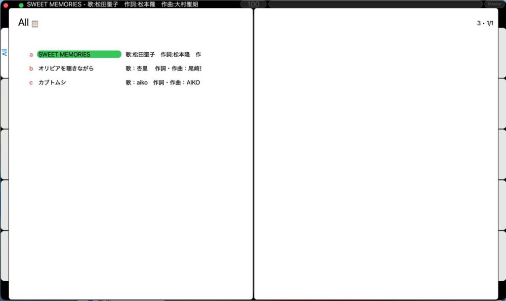 セットリストやコレクションをタブで整理・切り替えできるため、ライブ本番中もスムーズに曲を進行できます。
