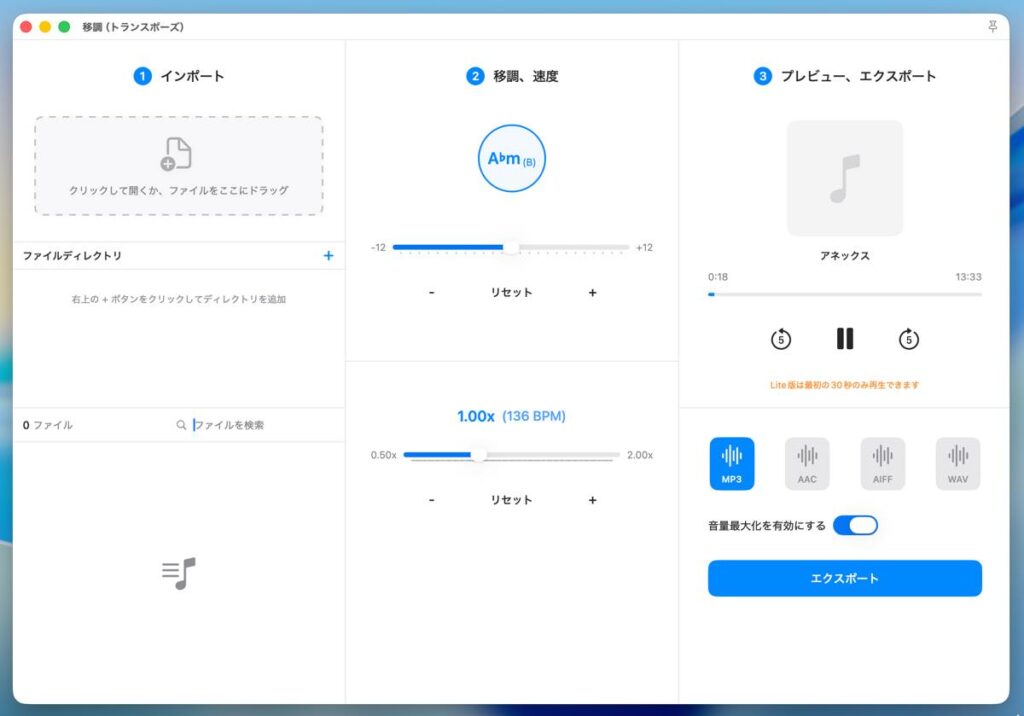 音楽ファイルや動画内の楽曲について、曲のキー(ピッチ)やテンポ(速度)を瞬時に変更できます。