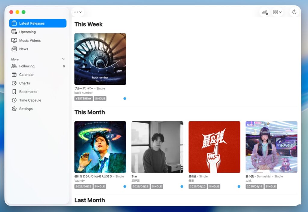 Apple MusicやSpotifyのアカウントと連携させることで、リリースされたばかりの楽曲やミュージックビデオ、関連ニュース、ライブ情報などを自動で収集し、一覧表示します。