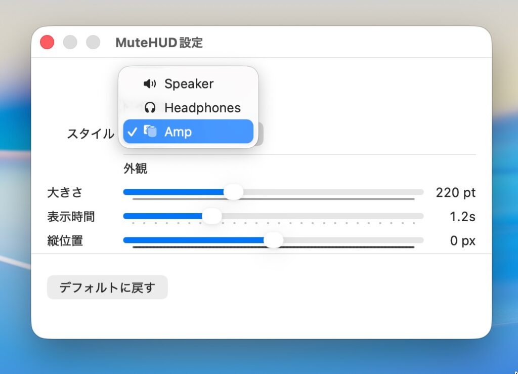 この「MuteHUD」を使うと、以前のOSバージョンと同じように、出力デバイスのミュート/ミュート解除の状態を画面中央にHUD表示できるようになります。うっかりミュート解除し忘れるといったトラブルを防ぐのに役立ちます。