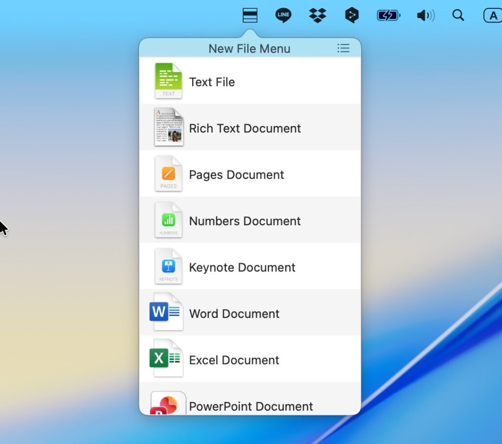 メニューバーのアイコンをクリックして目的の形式をデスクトップ等にドラッグ&ドロップするだけで、新規ファイルを作成できます。