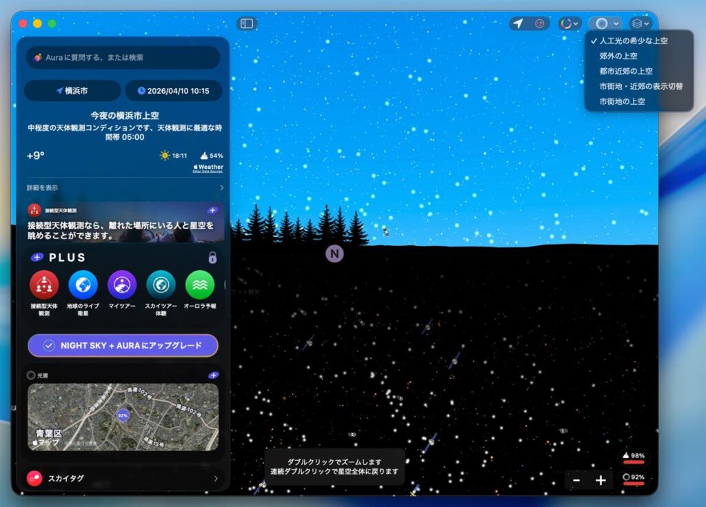 見たい方角にドラッグしたり、ダブルクックしてズームしたり、スターリンク衛星の上空通過時刻をプッシュ通知したり、カレンダーに登録された行き先にスカイツアーの提案を受けたりできます。