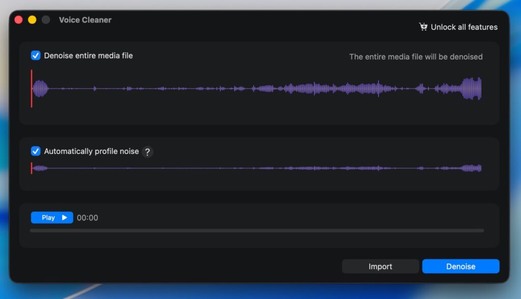 動画や音声ファイルを読み込んで「Denoise」ボタンをクリックするだけで、コンテンツに含まれるノイズ(サーッという音など)を自動的に除去してくれます。