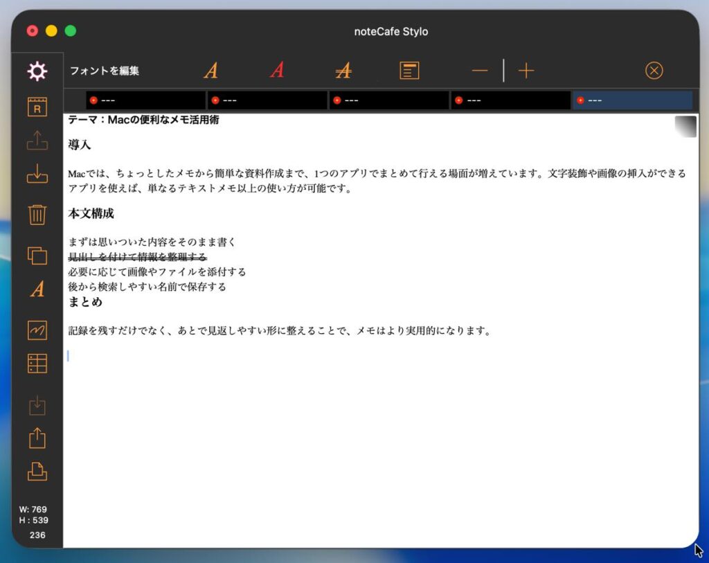 リッチテキスト(RTFD)で編集できるテキストエディタ