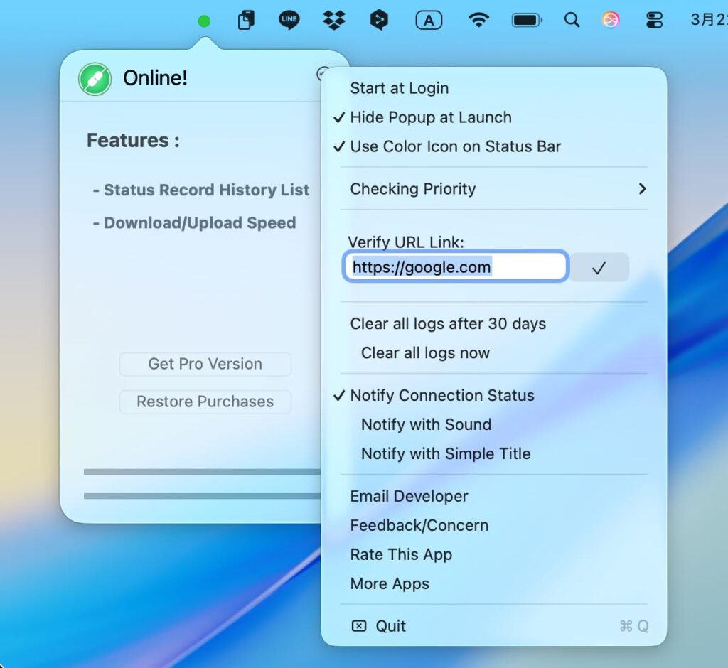 Macを高速クリーンアップ「BuhoCleaner」 HOME > ユーティリティ > ユーティリティ Online 2.13 - インターネットに接続されているかどうかをメニューバーで確認 2026年3月22日 Twitter Share Hatena LINE URLコピー 無料(App内課金あり) インターネットに接続されているかどうかを知らせる インターネットに接続されているとメニューバーに緑色のマークが表示され、切断されるとそれが赤色に変わります。 切断されたときや接続されたときに通知センターで通知する機能もあります。 App内課金で、ログ保存機能や回線速度を表示する機能が追加されます。 【変更点】 CSVへのエクスポート機能が追加されました。 Mac App Storeからダウンロード Twitter Share Hatena LINE URLコピー -ユーティリティ -ネット, メニューバー, 情報取得