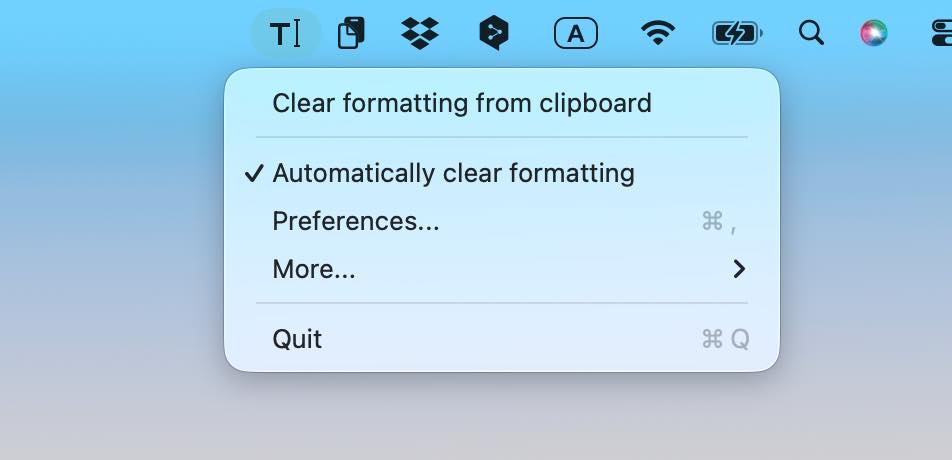 メニューバーのアイコンをクリックして、「Automatically Clear formatting」をオンにすると、標準テキストに自動変換されます。