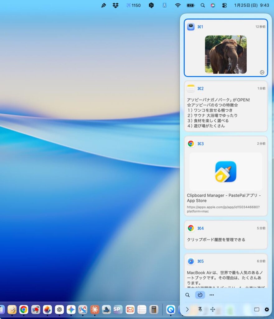 画面端のサイドバーから直近の履歴にすばやくアクセスしたり、Spotlightやキーボードショートカットから履歴を開くことも可能です。