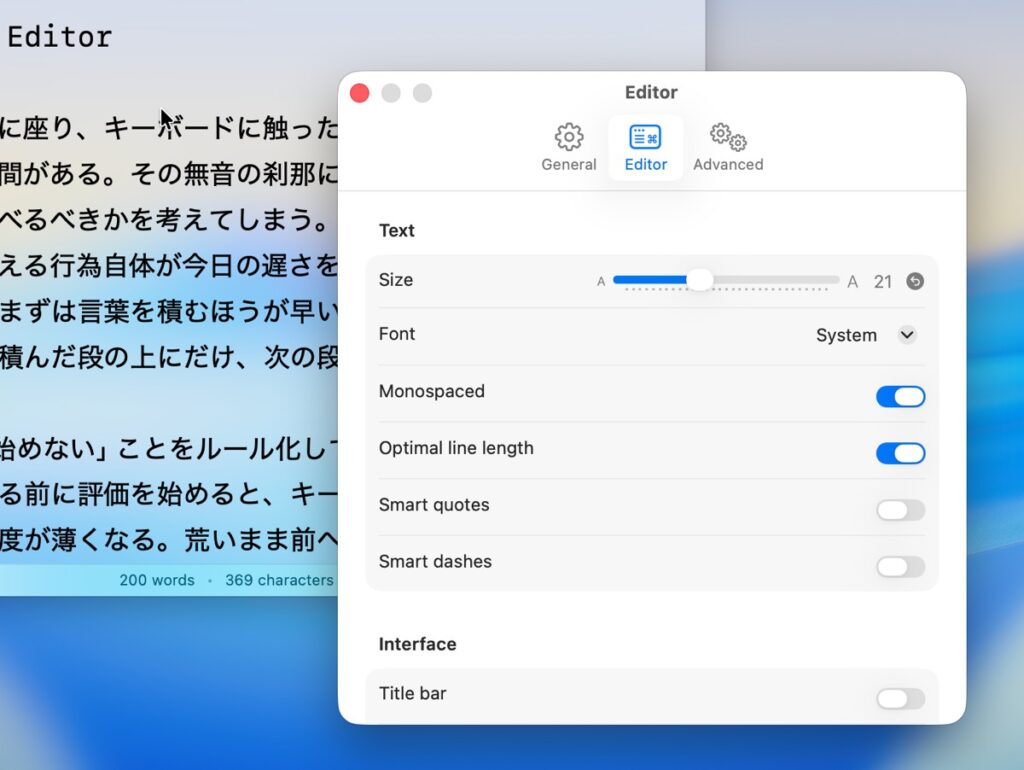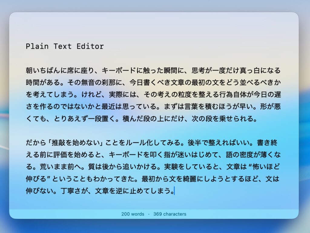 強調やフォント変更といった装飾機能を省き、とにかく「書くこと」だけに専念できる軽量テキストエディタ。文章作成やアイデアメモ、プログラムコードの下書きなどに適しています。