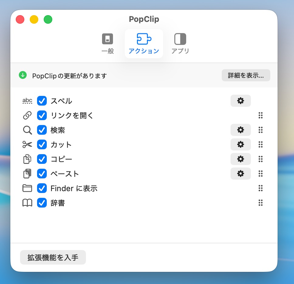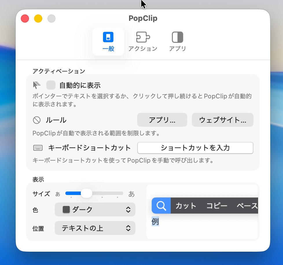PopClip 2025.9.1 - iOSのようなポップアップボタンを出現させてコピー&ペーストなどが行える