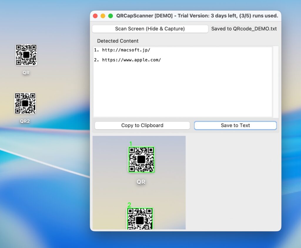 アプリを起動したら、ウインドウ上部にある「Scan Screen (Hide & Capture) 」をクリックして、範囲選択モードになったら読みたいQRコードをマウスで囲むと、自動的に解析されテキストが表示されます。