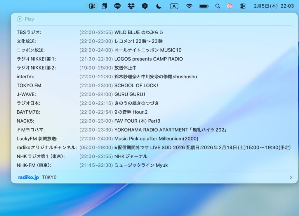 IPサイマルラジオ「radiko」をメニューバーから手軽に聴取