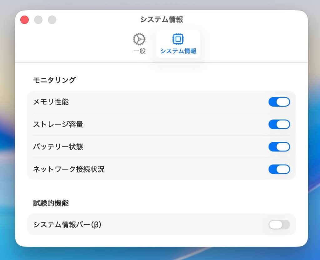 「設定」→「システム情報」から、「メニューバーに表示」にチェックすると、CPUやメモリ、ディスク、バッテリー、ストレージ、ネットワークの状況が数値で表示されます。