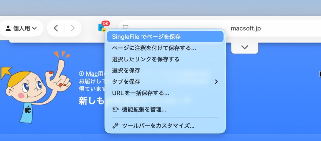 Webページ全体を、画像やスタイル、フォントなどを含んだ1つのHTMLファイルとして保存できるSafari機能拡張。