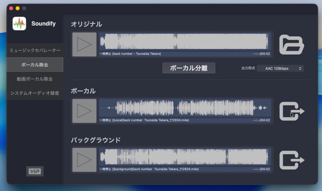 最新のAIによって処理されるため、従来のボーカルキャンセラーのような余分な音が残る、音質が劣化するといったことがほとんどなく、クリアに分離できるのが特徴です。