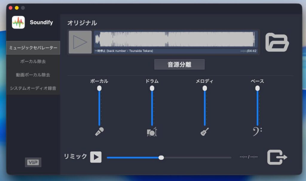 トラックをボーカル、ドラム、メロディ、ベースに分け、それぞれをリミックスして独自のサウンドを作成できます(ミュージックセパレーター)