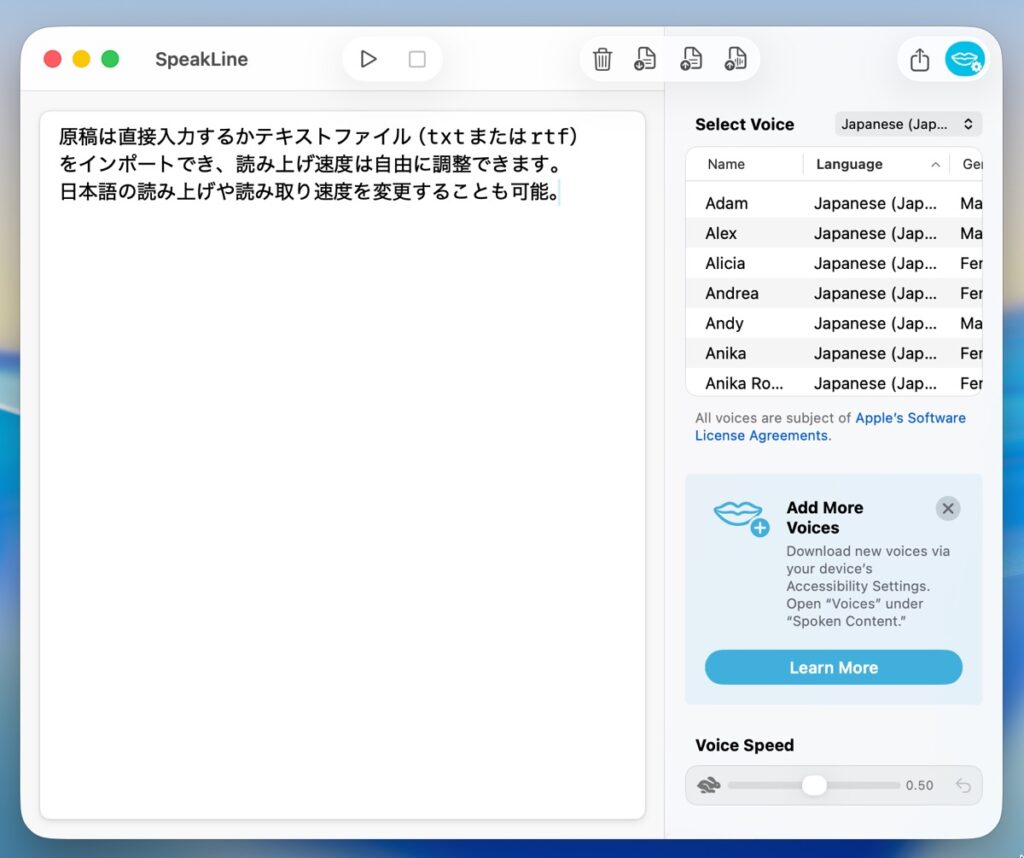 原稿は直接入力するかテキストファイル(txtまたはrtf)をインポートでき、読み上げ速度は自由に調整できます。日本語の読み上げや読み取り速度を変更することも可能。
