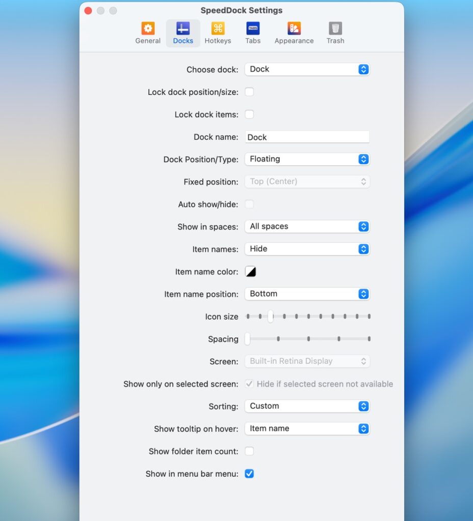 別のDockは複数作成でき、表示位置(上下左右)、アイコンサイズ・間隔、並び順、透明度など自在にカスタマイズできます。