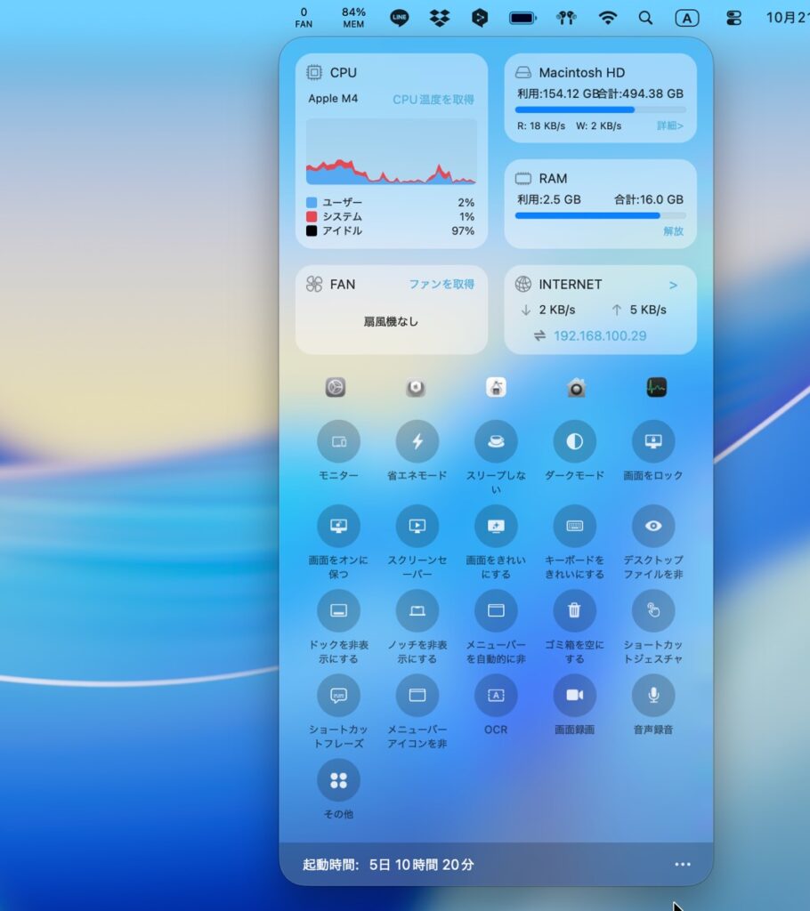 画面のクリーニング、キーボードのクリーニング、デスクトップファイルの非表示など、多くのクイック設定機能もあります。