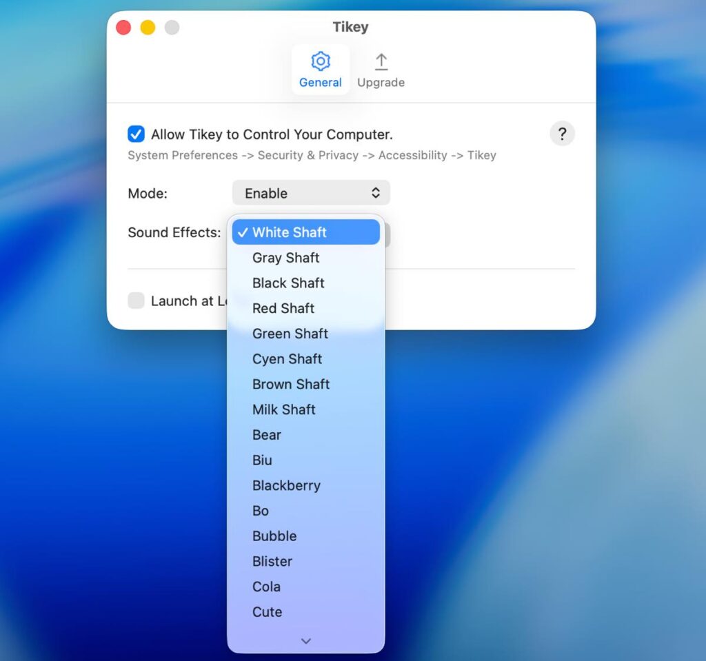 タイピングの音は、メカニカアルキーボード用スイッチである白軸、黒軸、赤軸、茶軸、緑軸などのほか、泡やコーラ、キュート、ドロップ、ジャンプ、iPadやマリオ、犬が吠え声をモチーフにしたものなど、30種類以上のサウンドが用意され、メニューバーから簡単に切り替えることができます。