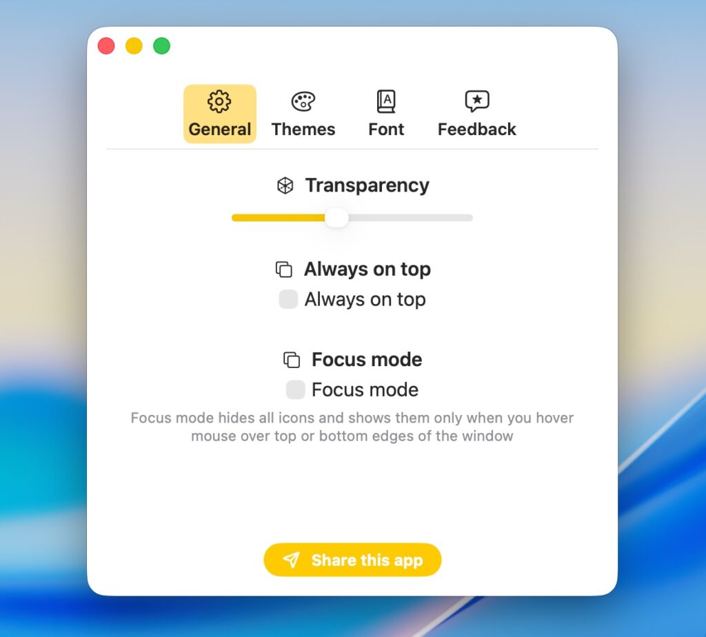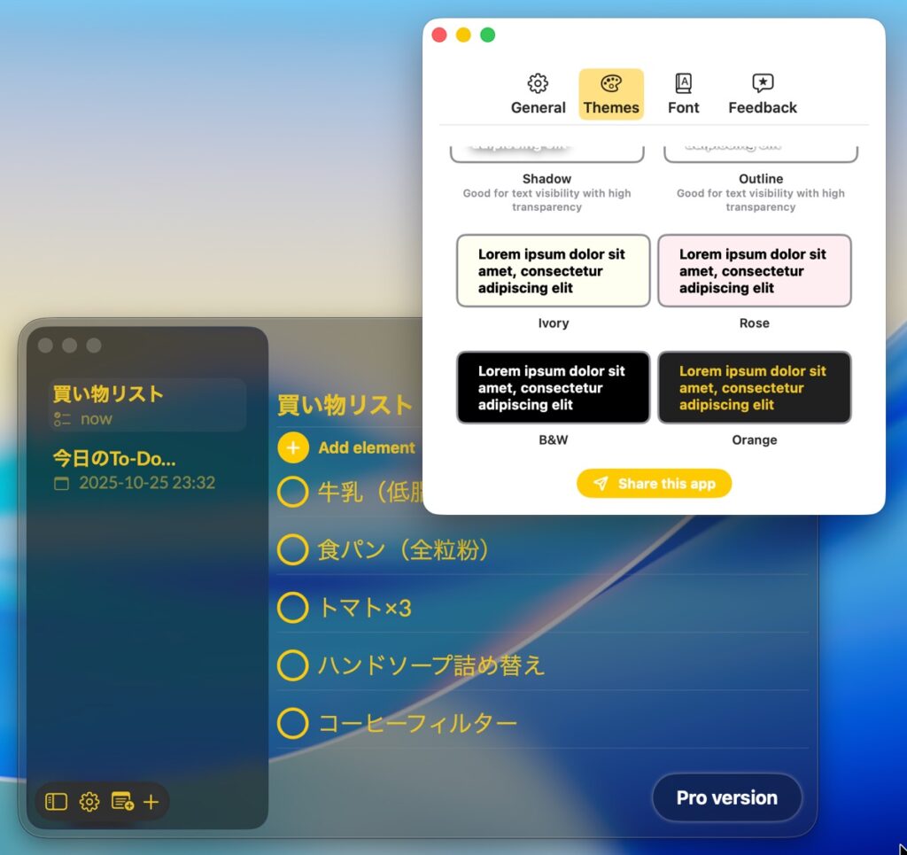 メモ画面の透明度はスライダーで自由に設定できます。テーマ切替機能もあります。