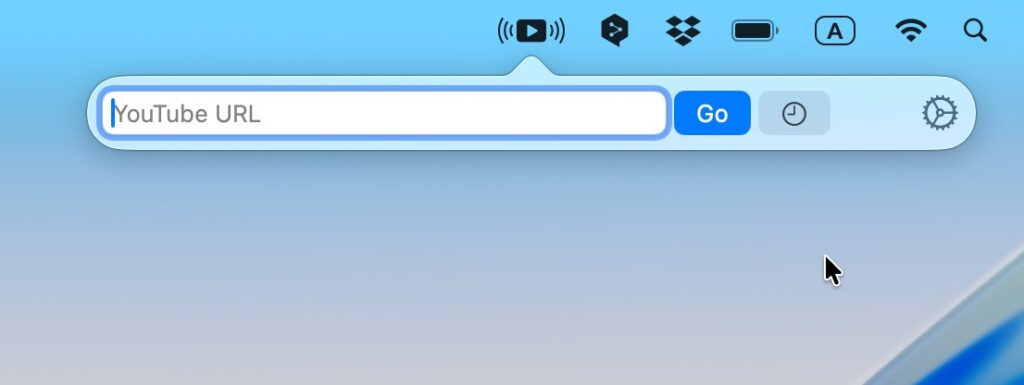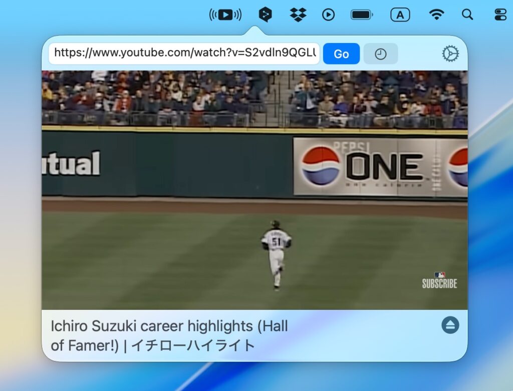 メニューバーから開くポップアップメニューに再生したい動画のURLを入力して「Go」をクリックするだけ。