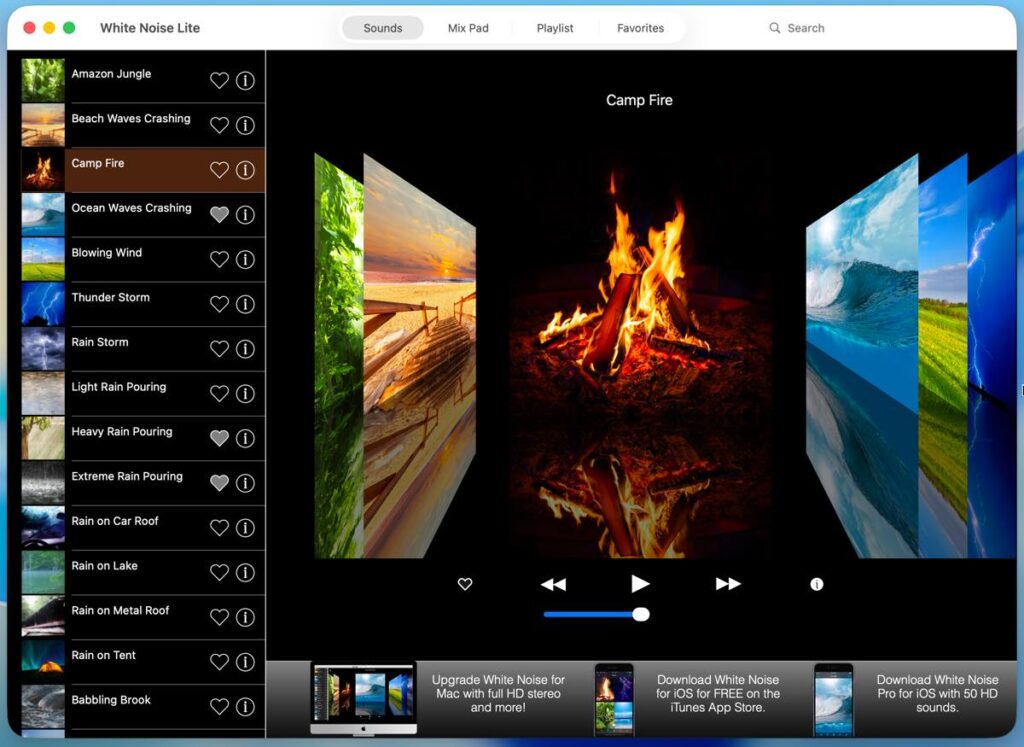 ジャングル、ビーチの波音、焚き火、風、雷、雨音、水滴、川、滝、シャワー、鳥、乾燥機、猫のいびき、カエル、エアコン、時計、風鈴、飛行機といった日常的な環境音をはじめ、集中力を高めたり学習効果が上がると言われるホワイトノイズ(シャーと聞こえる雑音)やピンクノイズ(ザーと聞こえる雑音)、あるいはヒーリング効果のありそうな、ゆったりとした音楽をエンドレスに再生できます。