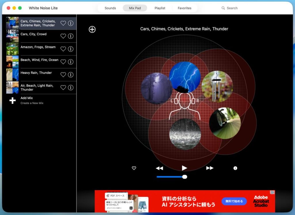 「Mix Pad」タブでは、複数のサウンドを組み合わせ、それぞれの音量や位置を調節して再生できます。