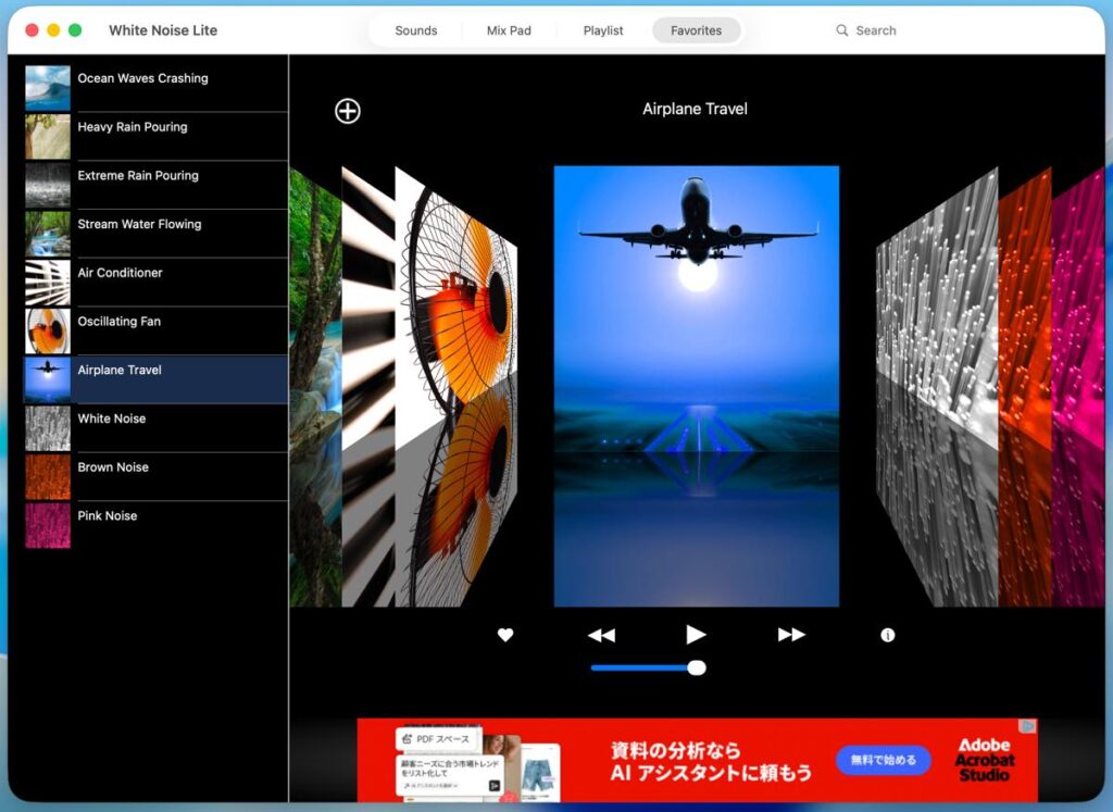「Playlist」タブでは、お気に入りの音をプレイリストに登録し、シャッフル再生することが可能です。