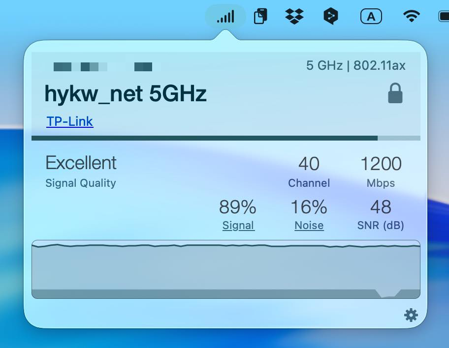 メニューバーにWi-Fiの信号強度をアイコン表示し、そこをクリックすると、アイコンネットワーク名、チャンネル、データ伝送レート、信号強度、ノイズ、IPアドレス、SNR(信号とノイズの比率)などの情報や、信号強度の推移グラフを参照できます。