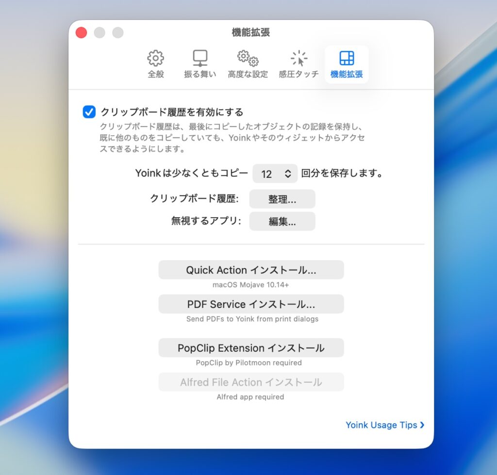 メニューのプルダウンメニューやYoinkウィジェットにコピー履歴が表示され、optionキーを押しながらウィジェットの項目をクリックすると、それがクリップボードに転送されるほか、Yoinkにも転送されます。ウィジェット内の項目をshiftキーを押しながらクリックすると、コピーしたアイテムが消えないように固定できます(鍵マークが付きます)。また、commandキーを押しながらウィジェットをクリックすると、コピー履歴ブラウザが開きます。