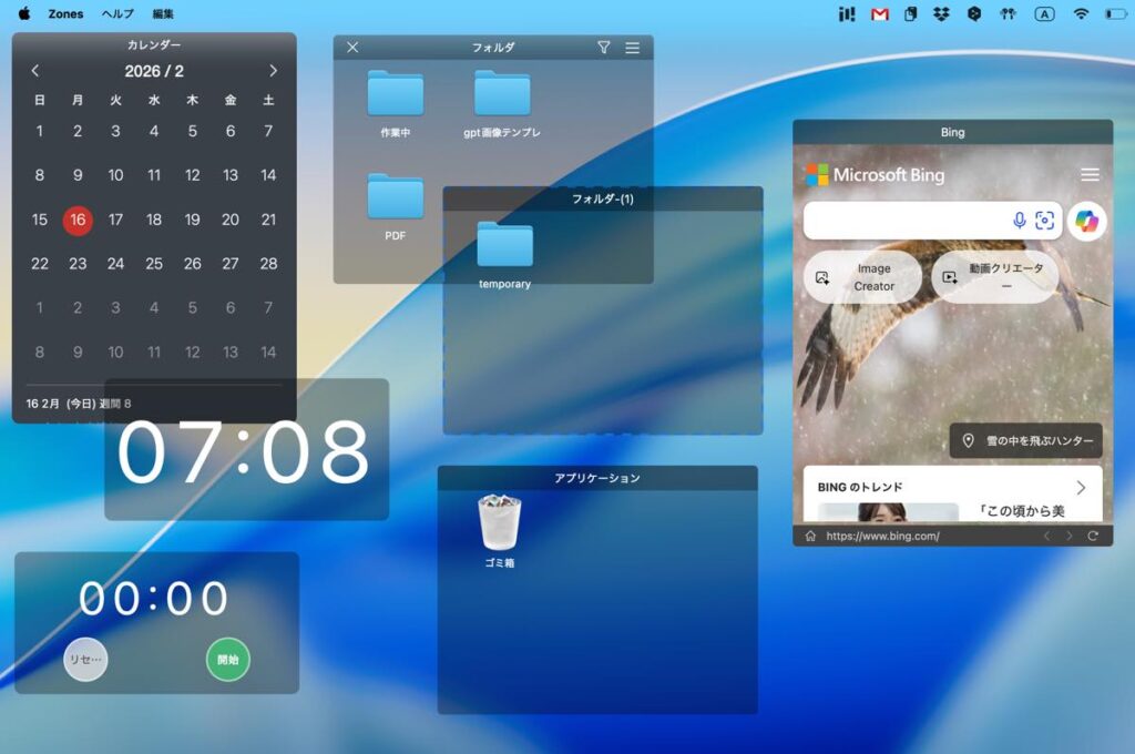 無料版ではゾーンを1つだけ作成できますが、App内課金で複数のゾーンを配置できるほか、カレンダー、時計、電卓の各ウィジェットも表示できます