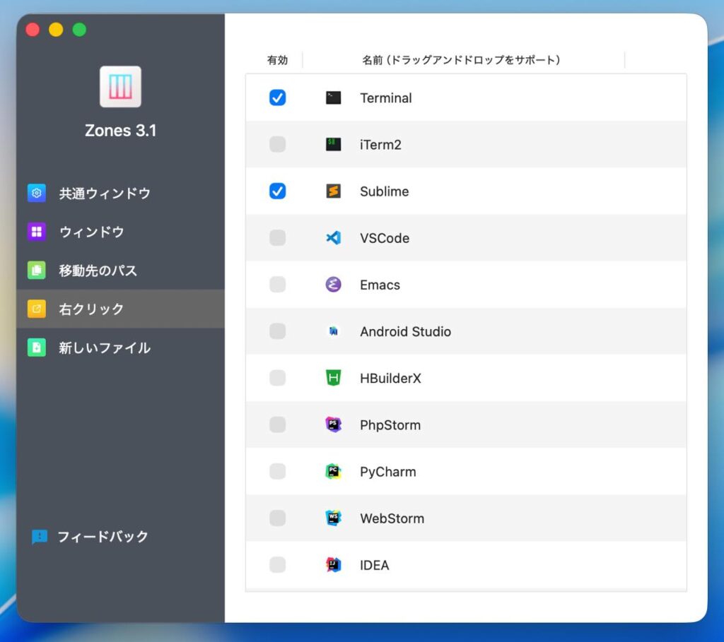 ゾーンには主要ソフトの新規ファイルを作成する項目やブックマークなども作成可能。